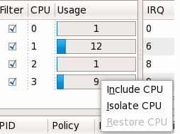 but most importantly, it lets you modify many process settings such as the scheduling priority and policy (click on the right mouse button while the cursor is above one of the process lines). It also has a special menu (click on the right mouse button while the cursor is above the CPU Usage frame) to include or isolate the available processors.